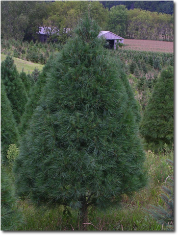 The white pine (Pinus strobus) is a fast-growing tree notable for its long, soft needles and flexible branches. Our white pines have the characteristic "cone" shape, as seen at right.